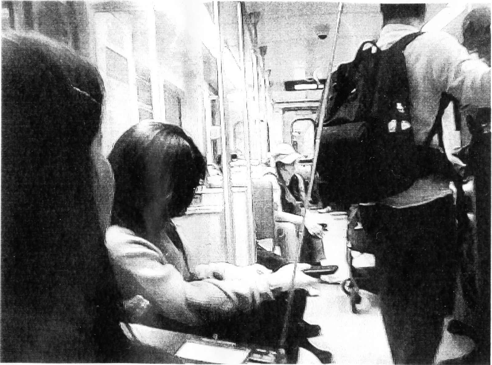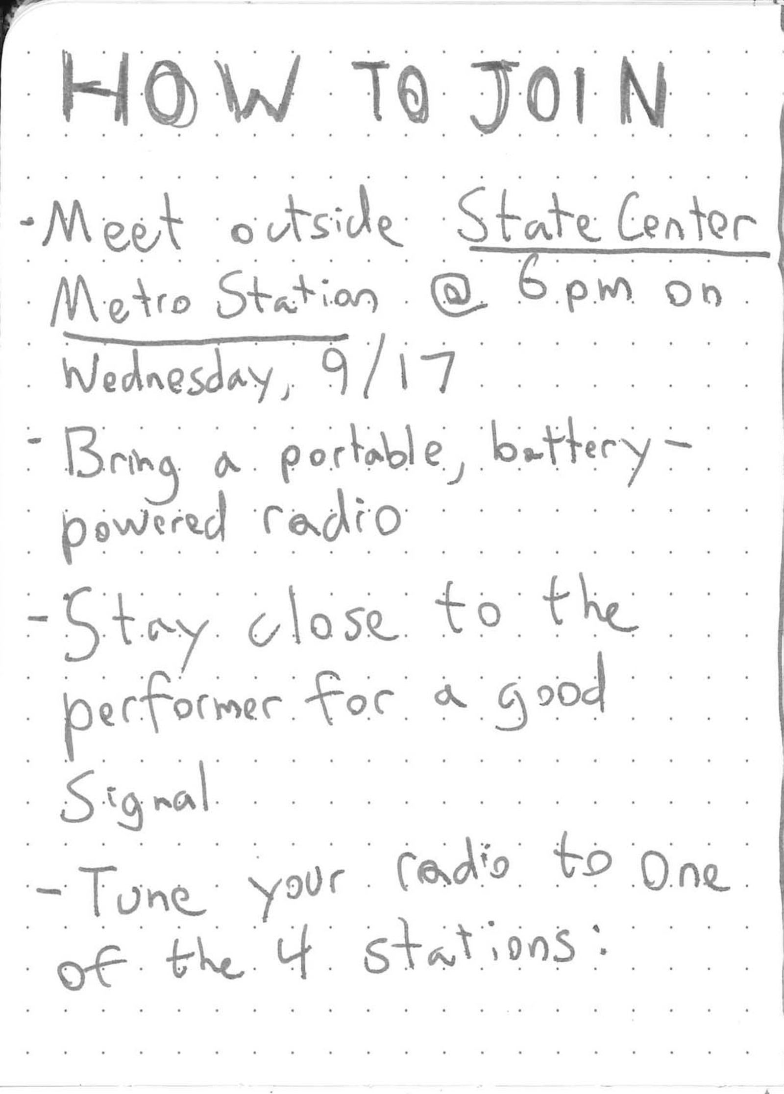 The performance begins outside the Metro Station, as the performer enters the station with attendees in tow. The performer walks through the station, through the fare gate (paying their fare!), and onto a subway car, all with attendees following along, carrying their radios. The group rides the subway back and forth along its route, with posted arrival times, allowing new attendees to join the group at other stations.